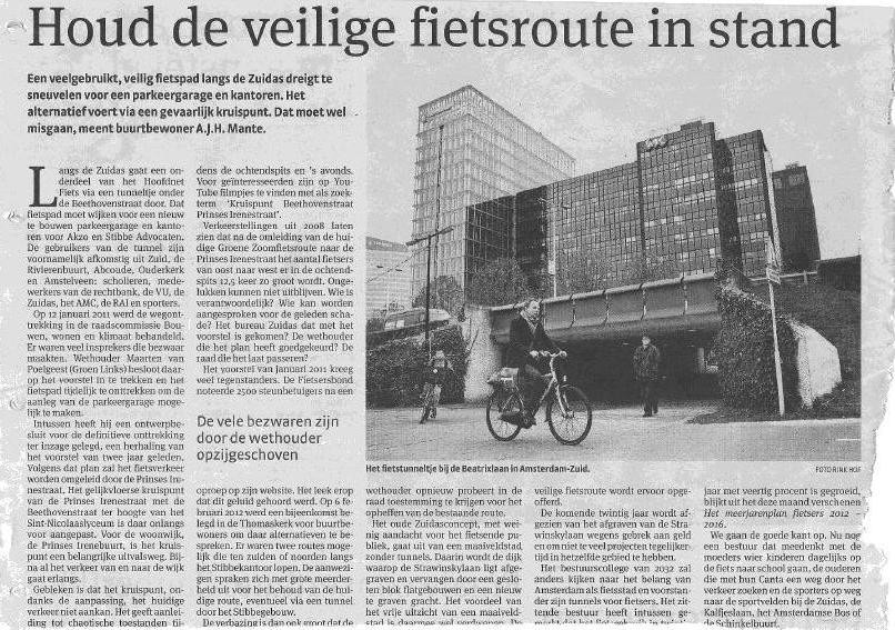 De Irenebuurt is bang dat de nu al onoverzichtelijke kruising Beethovenstraat-Prinses Irenestraat helemaal chaotisch wordt na opheffing van het fietspad in het Beatrixpark dat aansluit op het tunneltje onder de Beethovenstraat. Op 21 november 2012 kwam AT5 filmen nadat een groot artikel van buurtbewoner A.J.H. Mante was verschenen in Het Parool van 19 november 2012. Zie het item op AT5.
