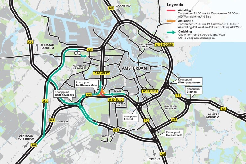 Van vrijdag 7 november 22.00 uur tot maandag 10 november 2025 05.00 uur is de verbindingsweg dicht tussen de A10 West en de A10 Zuid, richting A1 Hengelo en A2 Utrecht. Vanaf vrijdagavond 7 november 22.00 uur tot zaterdag 8 november 10.00 uur geldt dat ook voor de andere richting: A10 Zuid richting A10 West Leeuwarden/Zaanstad. De vertraging kan oplopen tot een halfuur.