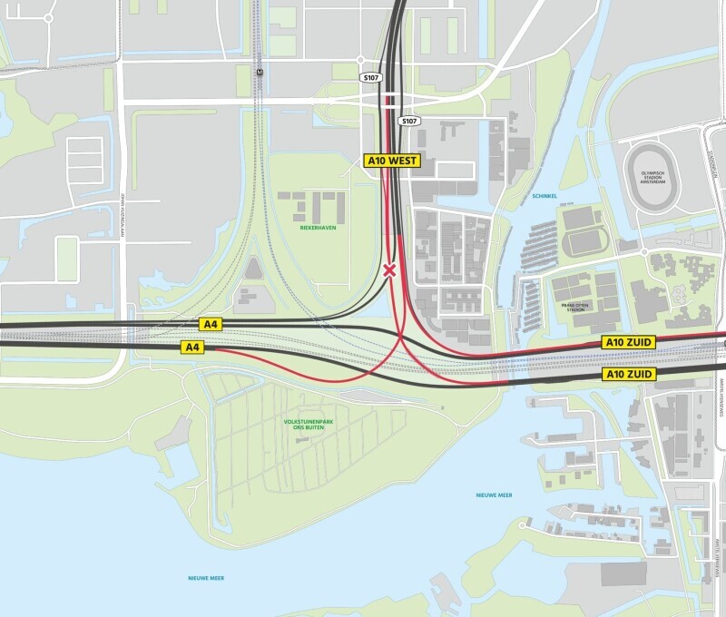 In de nachten van ditzelfde weekend is ook de S107 (Henk Sneevlietweg) gedeeltelijk dicht. Verkeer vanuit de stad kan geen gebruikmaken van oprit S107 richting knooppunt De Nieuwe Meer. Voor verkeer vanuit Amsterdam Nieuw-West is de oprit S107 richting de Coentunnel niet bereikbaar. Volg de borden voor lokale omleidingen.